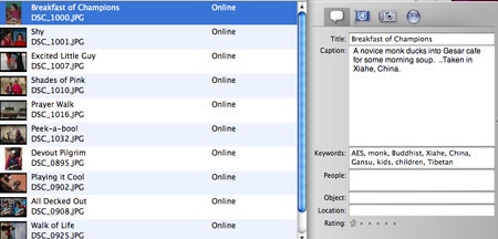 As a result of the import process, the window fills with photo thumbnails and summary information. If you click on an individual photo, you'll notice a small window on the right-side of your screen listing detailed documentation information about the photo. If you click the button with the conversation bubble on it, a screen will appear in which you can enter a title, caption, and keywords (tags) for the photo. This information will be automatically saved to the photo’s EXIF data.
