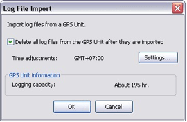- Click “Import Log Files” to import the GPS log files from the device to your computer.