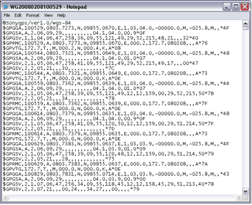 Inside the GPS directory, you’ll find each of the individual GPS logs generated by the Sony GPS-CS1KA. The device generates one log for each set of continuous signals. If the device is turned off and then back on, a new file will be created. Not that we’ve found it necessary, but the GPS Image Tracker does allow multiple files to be merged. Open the file in a simple text editor like Notepad and you’ll see all of the raw GPS data logged by the device. A detailed description of what each of the individual GPS records means is fortunately beyond the scope of this case study and not necessary to actually use the data.