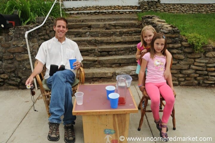 After a visit to the Saturday farmer’s market, we strolled the residential streets of Black Mountain, North Carolina and encountered Gracie and her friend, Elizabeth. Their sidewalk stand featured a container of ruby-colored juice and a stack of plastic cups.