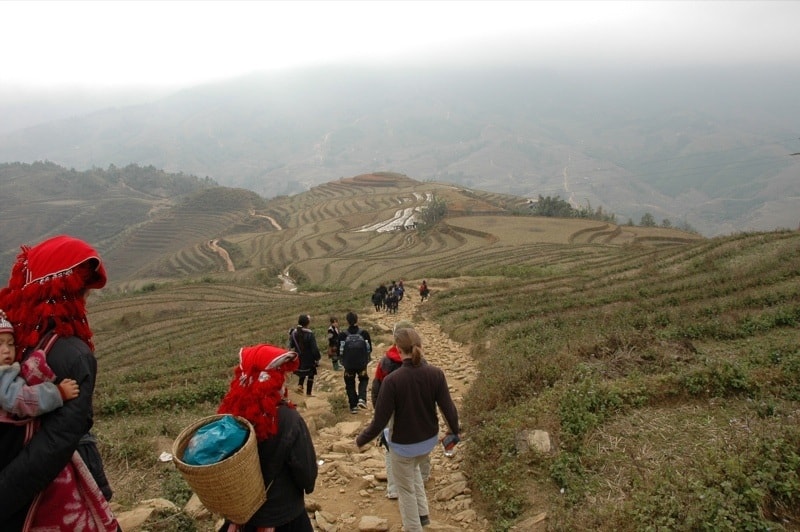 We had a long walk ahead of us and weren't interested in buying any souvenirs. We were waiting for the shopping opportunities at Bac Ha market. At one of the resting points, a Red Dao woman latched onto me. Acutely aware of her befriend-and-sell strategy, I told her straight away that we weren't shopping that day. The woman laughed and continued to walk with us.