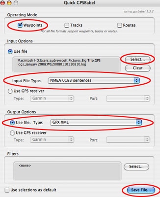 At this point of our process, Audrey takes the .log files (text files with GPS data) from Dan (using a USB memory stick) and takes the following steps on her Mac Powerbook to complete the process.