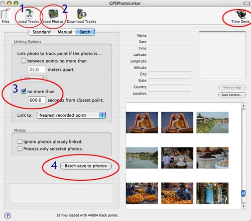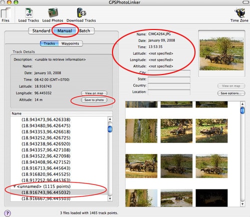 - Click “Load Tracks” and choose the .gpx files you want to use for geotagging (whose time stamps are close to the photos you'd like to match).