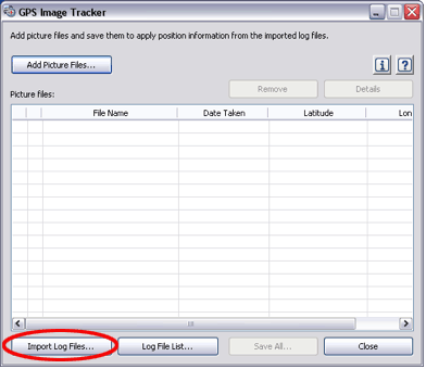 - Click “Import Log Files” to import the GPS log files from the device to your computer.