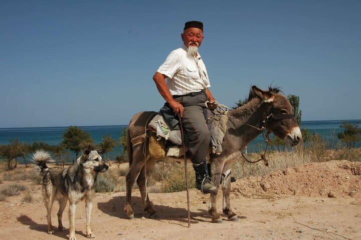Kyrgyz Man, Donkey and Dog - Lake Issyk-Kul, Kyrgyzstan